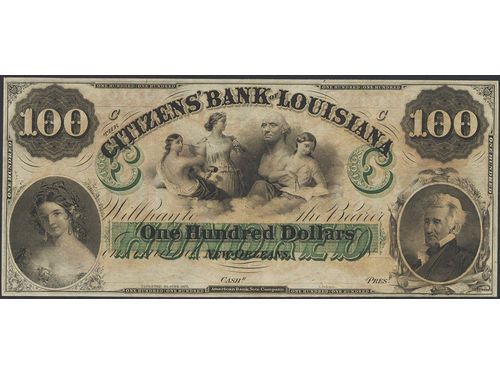 Banknotes, U.S.A. 100 dollars ND. 100 dollars C, 1857–1899, citizens bank of Louisiana. XF-UNC. Banknotes, U.S.A. 100 dollars ND. 100 dollars C, 1857–1899, citizens bank of Louisiana. XF-UNC. Visa mindre