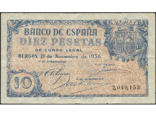 Banknotes, Spain. Pick 98, 10 pesetas 1936. No: 2049153. VG. Banknotes, Spain. Pick 98, 10 pesetas 1936. No: 2049153. VG. Visa mindre
