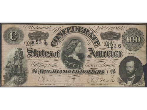 Banknotes, U.S.A., Confederate States - Richmond (TX). 100 dollar 1864. No: 8236. F. Banknotes, U.S.A., Confederate States - Richmond (TX). 100 dollar 1864. No: 8236. F. Visa mindre