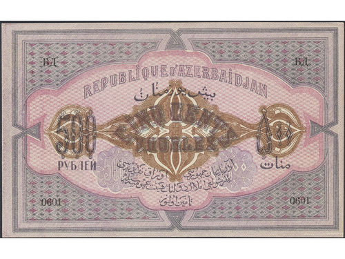 Banknotes, Azerbaijan. Pick 7, 500 roubles 1920. Crisp uncirculated note with minor handling marks. XF-UNC. Banknotes, Azerbaijan. Pick 7, 500 roubles 1920. Crisp uncirculated note with minor handling marks. XF-UNC. Visa mindre