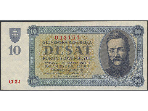 Banknotes, Slovakia. Pick 6a, 10 korun 1943. CI 32. 033151. Fresh note with small corner fold outside design. XF-UNC. Banknotes, Slovakia. Pick 6a, 10 korun 1943. CI 32. 033151. Fresh note with small corner fold outside design. XF-UNC. Visa mindre