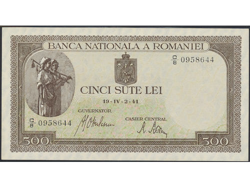 Banknotes, Romania. Pick 51a, 500 lei IV.2.1941. Graded by PMG as uncirculated 65 EPQ. UNC. Banknotes, Romania. Pick 51a, 500 lei IV.2.1941. Graded by PMG as uncirculated 65 EPQ. UNC. Visa mindre
