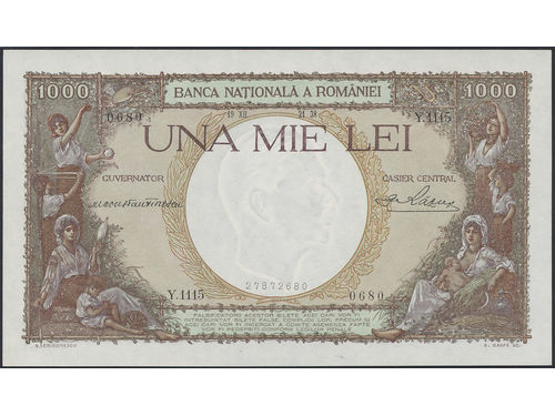 Banknotes, Romania. Pick 46, 1000 lei 19 XII 38. Graded by PMG as uncirculated 66 EPQ. UNC. Banknotes, Romania. Pick 46, 1000 lei 19 XII 38. Graded by PMG as uncirculated 66 EPQ. UNC. Visa mindre
