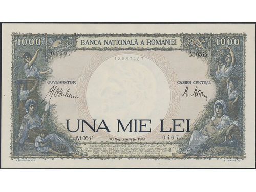 Banknotes, Romania. Pick 52a, 1000 lei 10.9.1941. Graded by PMG as uncirculated 66 EPQ. UNC. Banknotes, Romania. Pick 52a, 1000 lei 10.9.1941. Graded by PMG as uncirculated 66 EPQ. UNC. Visa mindre