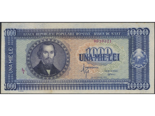 Banknotes, Romania. Pick 87, 1000 lei 1950. L/1 0030321. Graded by PMG as uncirculated 64. UNC. Banknotes, Romania. Pick 87, 1000 lei 1950. L/1 0030321. Graded by PMG as uncirculated 64. UNC. Visa mindre