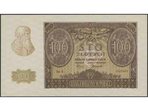 Banknotes, Poland. Pick 97x, 100 zlotych 1940. B 0685491. Contemporary forgery. Graded by PMG as uncirculated 66 EPQ. UNC. Banknotes, Poland. Pick 97x, 100 zlotych 1940. B 0685491. Contemporary forgery. Graded by PMG as uncirculated 66 EPQ. UNC. Visa mindre