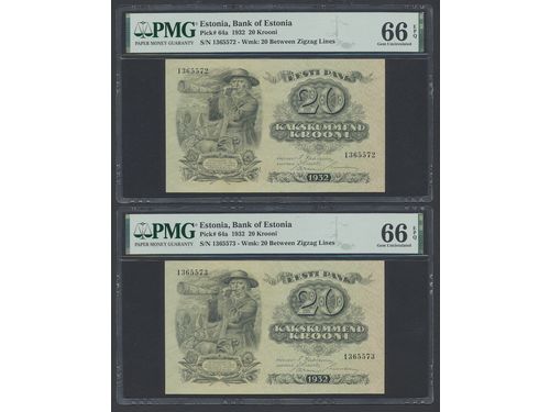Banknotes, Estonia. Pick 64a, 20 krooni 1932. 1365572–1365573. Two consecutive notes, both graded by PMG as uncirculated 66 EPQ. UNC. Banknotes, Estonia. Pick 64a, 20 krooni 1932. 1365572–1365573. Two consecutive notes, both graded by PMG as uncirculated 66 EPQ. UNC. Visa mindre
