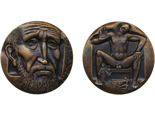 Medals, non-regal, Finland. Michelangelo. Three parts medal in bronze, 60 mm, 522 g., by K. Räsänen. In an elegant wooden case. Hackl 87. 01/0. Medals, non-regal, Finland. Michelangelo. Three parts medal in bronze, 60 mm, 522 g., by K. Räsänen. In an elegant wooden case. Hackl 87. 01/0. Visa mindre
