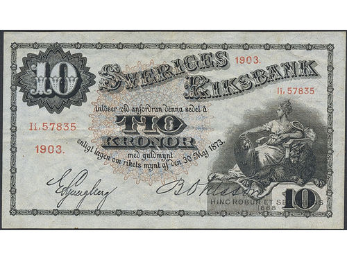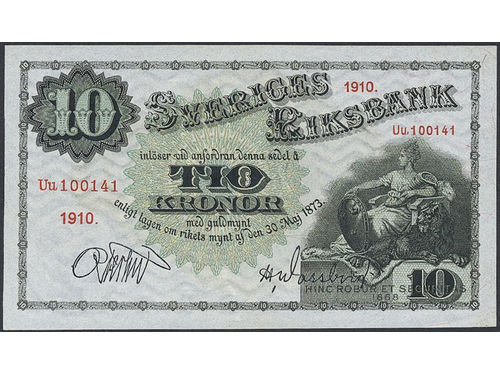 Banknotes, Sweden. SF K1:1, 10 riksdaler riksmynt 1859. Litt X No 014187. Fresh example with good paper quality. 1/1+.