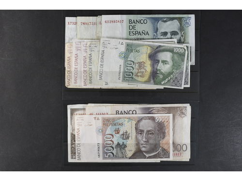Banknotes, Spain. 15 Peseta bank notes incl. three 5000, three 2000, eight 1000 and one 100. Mixed quality. Banknotes, Spain. 15 Peseta bank notes incl. three 5000, three 2000, eight 1000 and one 100. Mixed quality. Visa mindre