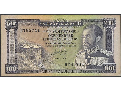 Banknotes, Ethiopia. Pick 29, 100 dollars ND(1966). No: B 785744. VF-XF. Banknotes, Ethiopia. Pick 29, 100 dollars ND(1966). No: B 785744. VF-XF. Visa mindre