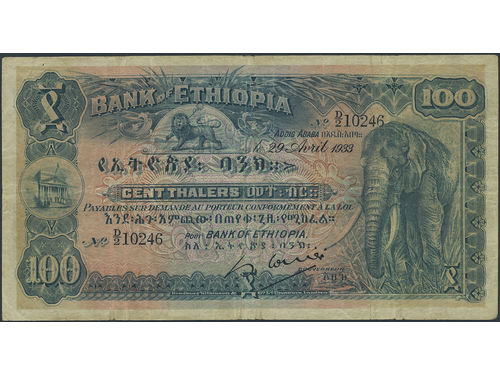 Banknotes, Ethiopia. Pick 10, 100 thalers 1933. No: D72 10246 in PMG as 25 very fine. VF. Banknotes, Ethiopia. Pick 10, 100 thalers 1933. No: D72 10246 in PMG as 25 very fine. VF. Visa mindre