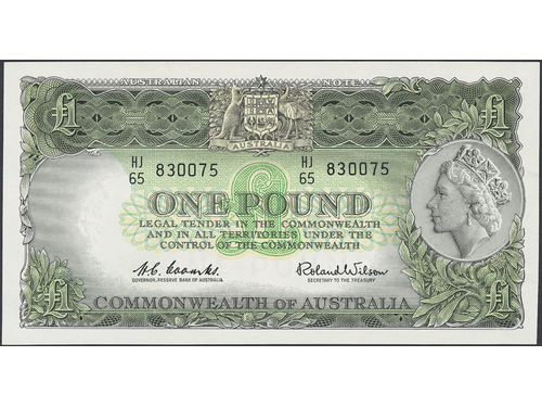 Banknotes, Australia. Pick 34 a, 1 pound ND. No: HJ/65 830075, (1961-65). UNC. Banknotes, Australia. Pick 34 a, 1 pound ND. No: HJ/65 830075, (1961-65). UNC. Visa mindre