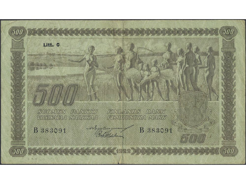 Banknotes, Finland. Pick 66, 500 markkaa 1922. No: Litt C, B383091. F. Banknotes, Finland. Pick 66, 500 markkaa 1922. No: Litt C, B383091. F. Visa mindre