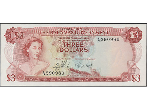 Banknotes, Bahamas. Pick 19, 3 dollars 1965. No: A 290980. UNC. Banknotes, Bahamas. Pick 19, 3 dollars 1965. No: A 290980. UNC. Visa mindre