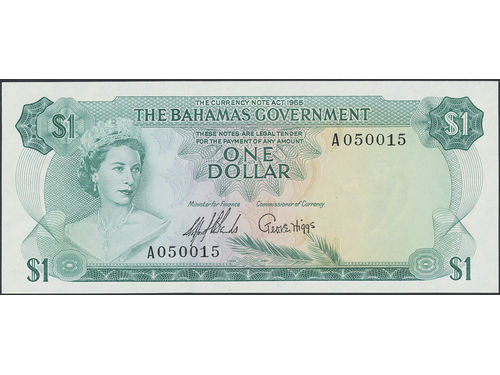 Banknotes, Bahamas. Pick 18, 1 dollar 1965. No: A 50015. UNC. Banknotes, Bahamas. Pick 18, 1 dollar 1965. No: A 50015. UNC. Visa mindre