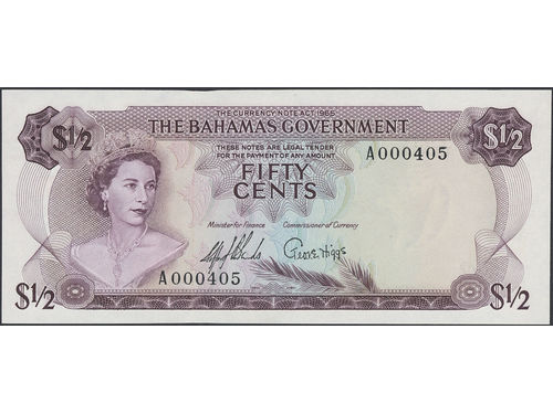 Banknotes, Bahamas. Pick 17, ½ dollar 1965. No: A 405. UNC. Banknotes, Bahamas. Pick 17, ½ dollar 1965. No: A 405. UNC. Visa mindre