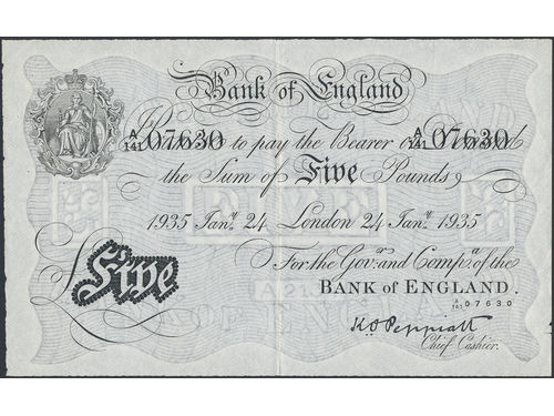 Banknotes, Great Britain. Pick 335 a, 5 pounds 1935. No: A 141 7630. F. Banknotes, Great Britain. Pick 335 a, 5 pounds 1935. No: A 141 7630. F. Visa mindre