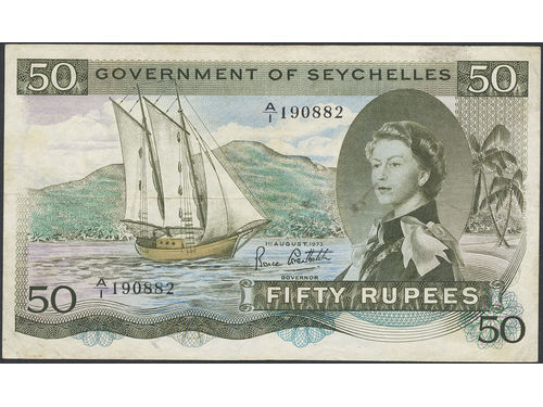 Banknotes, Seychelles. Pick 17 e, 50 rupees 1973. No: A/I 190882, 1/8 1973. Small trace of adheshive on back. VF. Banknotes, Seychelles. Pick 17 e, 50 rupees 1973. No: A/I 190882, 1/8 1973. Small trace of adheshive on back. VF. Visa mindre
