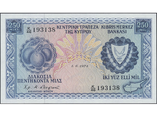 Banknotes, Cyprus. Pick 41, 250 mils 1974. No: K/46 193138, 1/6 1974. UNC. Banknotes, Cyprus. Pick 41, 250 mils 1974. No: K/46 193138, 1/6 1974. UNC. Visa mindre