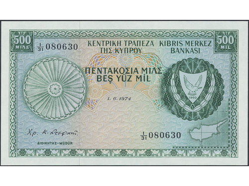 Banknotes, Cyprus. Pick 42, 500 mils 1974. No: 1/31 80630, 1/6 1974. UNC. Banknotes, Cyprus. Pick 42, 500 mils 1974. No: 1/31 80630, 1/6 1974. UNC. Visa mindre