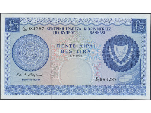 Banknotes, Cyprus. Pick 44 c, 5 pounds 1974. No: o/143 984287, 1/6 1974. UNC. Banknotes, Cyprus. Pick 44 c, 5 pounds 1974. No: o/143 984287, 1/6 1974. UNC. Visa mindre