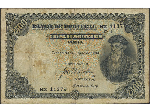 Banknotes, Portugal. Pick 107, 2½ mil reis ND. No: NX 11379. old date 30/6 1909. F. Banknotes, Portugal. Pick 107, 2½ mil reis ND. No: NX 11379. old date 30/6 1909. F. Visa mindre
