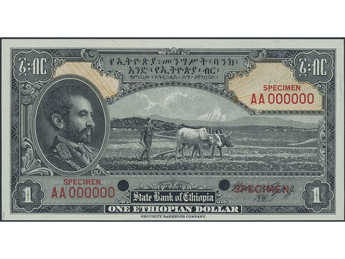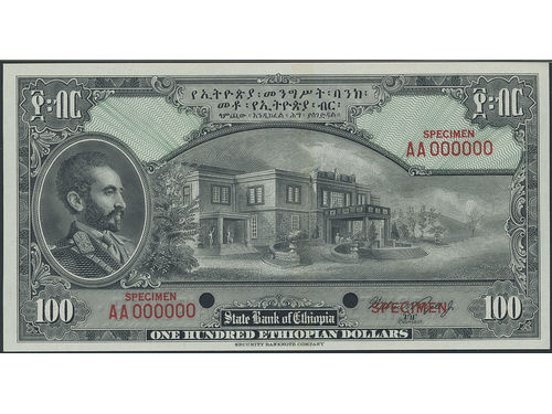 Banknotes, Ethiopia. Pick 16s2, 100 dollars ND (1945). Specimen note. Graded by PMG as uncirculated 65 EPQ. UNC. Banknotes, Ethiopia. Pick 16s2, 100 dollars ND (1945). Specimen note. Graded by PMG as uncirculated 65 EPQ. UNC. Visa mindre