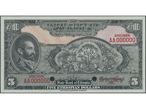 Banknotes, Ethiopia. Pick 13s2, 5 dollars ND (1945). Specimen note. Graded by PMG as uncirculated 66 EPQ. UNC. Banknotes, Ethiopia. Pick 13s2, 5 dollars ND (1945). Specimen note. Graded by PMG as uncirculated 66 EPQ. UNC. Visa mindre