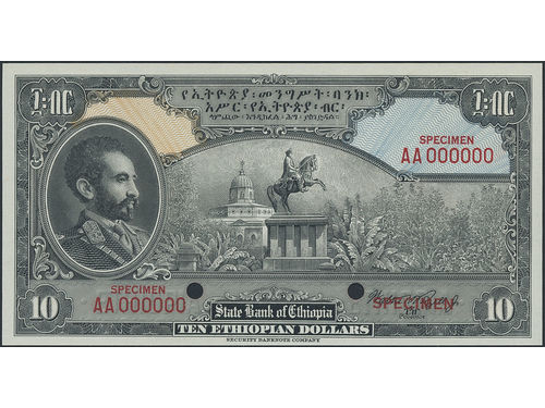 Banknotes, Ethiopia. Pick 14s2, 10 dollars ND (1945). Specimen note. Graded by PMG as uncirculated 65 EPQ. UNC. Banknotes, Ethiopia. Pick 14s2, 10 dollars ND (1945). Specimen note. Graded by PMG as uncirculated 65 EPQ. UNC. Visa mindre