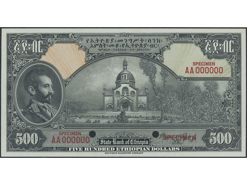 Banknotes, Ethiopia. Pick 17s2, 500 dollars ND (1945). Specimen note. Graded by PMG as uncirculated 66 EPQ. UNC. Banknotes, Ethiopia. Pick 17s2, 500 dollars ND (1945). Specimen note. Graded by PMG as uncirculated 66 EPQ. UNC. Visa mindre