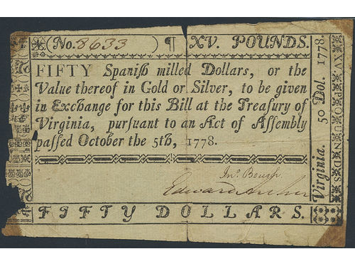 Banknotes, U.S.A. Fr VA-162, 50 dollars 1778. No 8633. Dated October 5. Graded by PMG as very good 10 NET. Tears, paper.. Läs mer Banknotes, U.S.A. Fr VA-162, 50 dollars 1778. No 8633. Dated October 5. Graded by PMG as very good 10 NET. Tears, paper loss in margin and previously mounted in corners on back. VG. Visa mindre