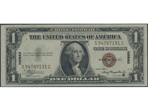 Banknotes, U.S.A. Fr 2300, 1 dollar 1935 A. S54767131C. Hawaii. Graded by PMG as uncirculated 64 NET. PMG comment is 'th.. Läs mer Banknotes, U.S.A. Fr 2300, 1 dollar 1935 A. S54767131C. Hawaii. Graded by PMG as uncirculated 64 NET. PMG comment is 'thinning', but according to our inspection it looks like a grease spot and not in fact thinning. We believe this would not today attract a NET grade. UNC. Visa mindre