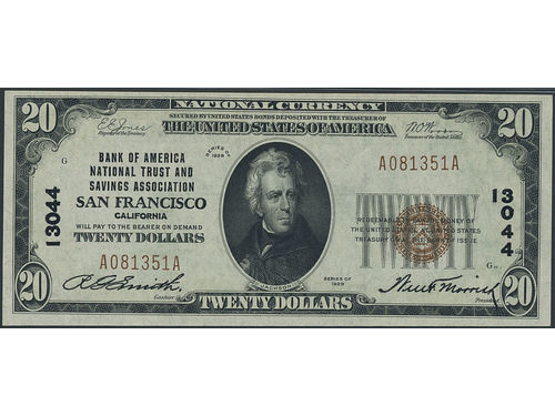 Banknotes, U.S.A. Fr 1802-01, 20 dollars 1929. A081351A. San Francisco – Bank of National Trust & Savings Associatio.. Läs mer Banknotes, U.S.A. Fr 1802-01, 20 dollars 1929. A081351A. San Francisco – Bank of National Trust & Savings Association. Graded by PMG as uncirculated 64 EPQ. UNC. Visa mindre