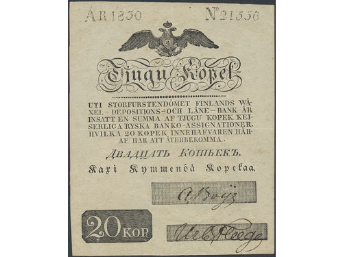 Banknotes, Finland. Pick A24, 20 kopeks 1830. No 21556. Excellent example with fresh paper quality – lightly cross folded. 1+. Banknotes, Finland. Pick A24, 20 kopeks 1830. No 21556. Excellent example with fresh paper quality – lightly cross folded. 1+. Visa mindre