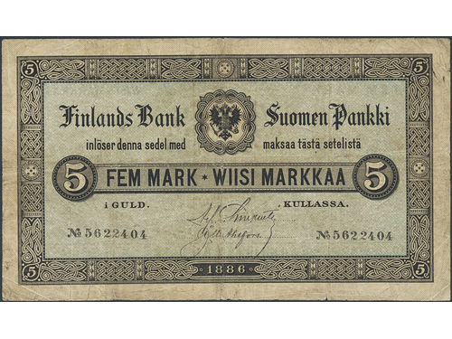 Banknotes, Finland. Pick A50b, 5 markkaa 1886. No 5622404. Pressed. Minor tear in lower margin, else nice colour and appearance. 1?/1. Banknotes, Finland. Pick A50b, 5 markkaa 1886. No 5622404. Pressed. Minor tear in lower margin, else nice colour and appearance. 1?/1. Visa mindre