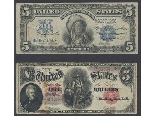 Banknotes, U.S.A. 5 dollars Series 1899. M 99871956. Several creases, slightly unfresh. Ex. Antikören auktion 16, lot 62.. Läs mer Banknotes, U.S.A. 5 dollars Series 1899. M 99871956. Several creases, slightly unfresh. Ex. Antikören auktion 16, lot 626 + 5 dollars Series 1907. K 90130440. Stains, small holes, marginals damaged. Ex. Ahlström auktion 51, lot 1126. 1?/1-1? Visa mindre
