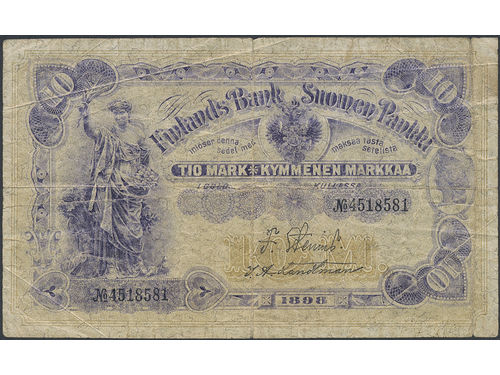 Banknotes, Finland. Pick 3c, 10 markkaa 1898. No 4518581. Signatures Stenius and Landtman. Minor tears. 1? Banknotes, Finland. Pick 3c, 10 markkaa 1898. No 4518581. Signatures Stenius and Landtman. Minor tears. 1? Visa mindre