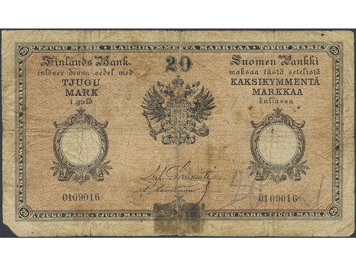 Banknotes, Finland. Pick A52, 20 markkaa 1894. No 0109016. Minor corner missing and tape damage. Tears and ink writing. 1? Banknotes, Finland. Pick A52, 20 markkaa 1894. No 0109016. Minor corner missing and tape damage. Tears and ink writing. 1? Visa mindre