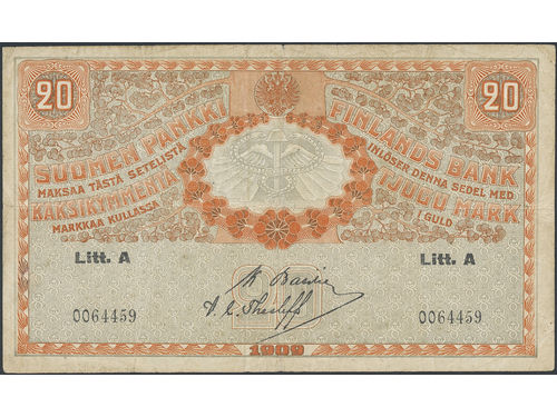 Banknotes, Finland. Pick 26, 20 markkaa 1909. 0064459 Litt A. Scarce issue from Independent Finland with Litt. A. Approx. 10 recorded examples. 1?/1. Banknotes, Finland. Pick 26, 20 markkaa 1909. 0064459 Litt A. Scarce issue from Independent Finland with Litt. A. Approx. 10 recorded examples. 1?/1. Visa mindre