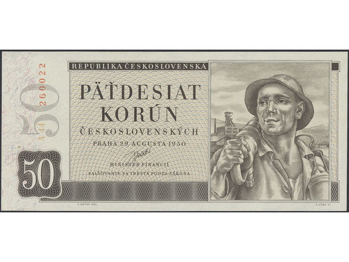Banknotes, Czechoslovakia. Pick 71a, 50 korun 1950. A 44 260022. Fresh note without folds. XF-UNC. Banknotes, Czechoslovakia. Pick 71a, 50 korun 1950. A 44 260022. Fresh note without folds. XF-UNC. Visa mindre
