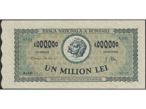 Banknotes, Romania. Pick 60a, 1000000 lei 1947. Graded by PMG as uncirculated 64. Slight foxing in lower left corner preventing EPQ designation. UNC. Banknotes, Romania. Pick 60a, 1000000 lei 1947. Graded by PMG as uncirculated 64. Slight foxing in lower left corner preventing EPQ designation. UNC. Visa mindre