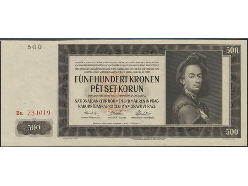 Banknotes, Czechoslovakia, Bohemia and Moravia. Pick 12a, 500 korun 1942. BA734019. Graded by PMG as uncirculated 64 EPQ. UNC. Banknotes, Czechoslovakia, Bohemia and Moravia. Pick 12a, 500 korun 1942. BA734019. Graded by PMG as uncirculated 64 EPQ. UNC. Visa mindre