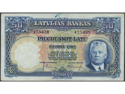 Banknotes, Latvia. Pick 20a, 50 latu 1934. 475438. Small crayon mark in blue. VF. Banknotes, Latvia. Pick 20a, 50 latu 1934. 475438. Small crayon mark in blue. VF. Visa mindre