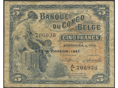 Banknotes, Belgian Congo. Pick 13A, 5 francs 10.04.1947. A/L 706936. F. Banknotes, Belgian Congo. Pick 13A, 5 francs 10.04.1947. A/L 706936. F. Visa mindre