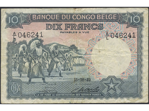 Banknotes, Belgian Congo. Pick 14E, 10 francs 15.08.49. A/L 046241. Minor foxing. F-VF. Banknotes, Belgian Congo. Pick 14E, 10 francs 15.08.49. A/L 046241. Minor foxing. F-VF. Visa mindre