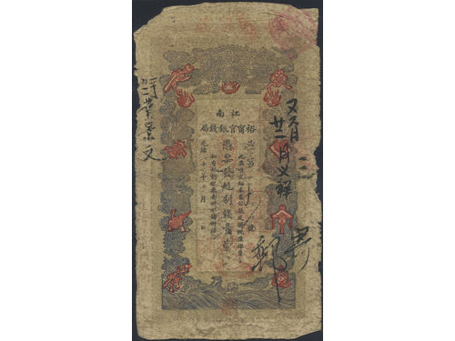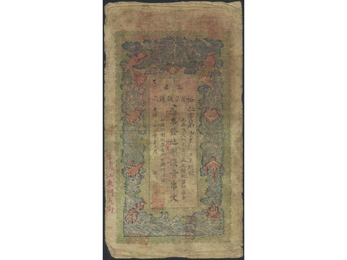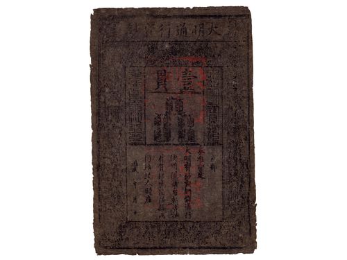 Banknotes, China - Empire. Pick A10, 1 kuan (1000 cash) ca. 1380. 34×22 cm, Hung Wu era (1368–1399) of early Ming dynast.. Läs mer Banknotes, China - Empire. Pick A10, 1 kuan (1000 cash) ca. 1380. 34×22 cm, Hung Wu era (1368–1399) of early Ming dynasty, ex Sophus Black (1888–1960). VF. Visa mindre