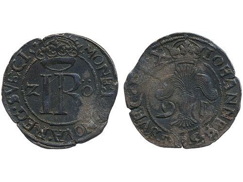 Coins, Sweden. Johan III, SM 78, 2 öre 1591. 2.15 g. Stockholm. Small planchet cracks. Obv SVEC, rev SVECI. 1+. Coins, Sweden. Johan III, SM 78, 2 öre 1591. 2.15 g. Stockholm. Small planchet cracks. Obv SVEC, rev SVECI. 1+. Visa mindre