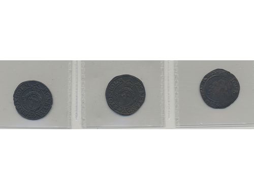 Coins, Sweden. Johan III, 2 öre. Three bronze coins, 2 öre 1573 ZR, 2 öre 1573 ZR and 2 öre 1592, mixed quality. Coins, Sweden. Johan III, 2 öre. Three bronze coins, 2 öre 1573 ZR, 2 öre 1573 ZR and 2 öre 1592, mixed quality. Visa mindre
