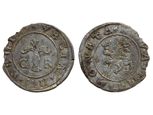 Coins, Sweden. Karl IX, SM 77a, 1 öre 1611. 1.41 g. Stockholm. Somewhat irregular planchet. 1+/01. Coins, Sweden. Karl IX, SM 77a, 1 öre 1611. 1.41 g. Stockholm. Somewhat irregular planchet. 1+/01. Visa mindre